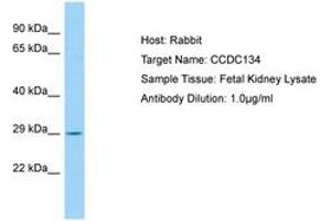 Synthetic peptide located between aa143-192 of human CCDC134 (Q9H6E4, NP_079097). Percent identity by BLAST analysis: Human (100%), Chimpanzee, Gorilla, Orangutan, Gibbon, Monkey, Galago, Marmoset, Elephant, Panda, Dog, Bat, Rabbit, Horse (92%), Bovine, Guinea pig (85%), Rat (84%), Mouse (78%).