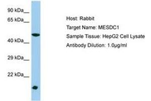 Synthetic peptide located between aa21-70 of human MESDC1 (Q9H1K6, NP_072088). Percent identity by BLAST analysis: Human, Chimpanzee (100%).
