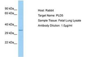 Synthetic peptide located between aa189-238 of human PLD5 (Q8N7P1-3, NP_001182741). Percent identity by BLAST analysis: Human, Chimpanzee, Gorilla, Orangutan, Gibbon, Monkey, Galago, Marmoset, Horse (100%), Mouse, Rat, Guinea pig (92%), Elephant, Panda (85%), Dog (84%).