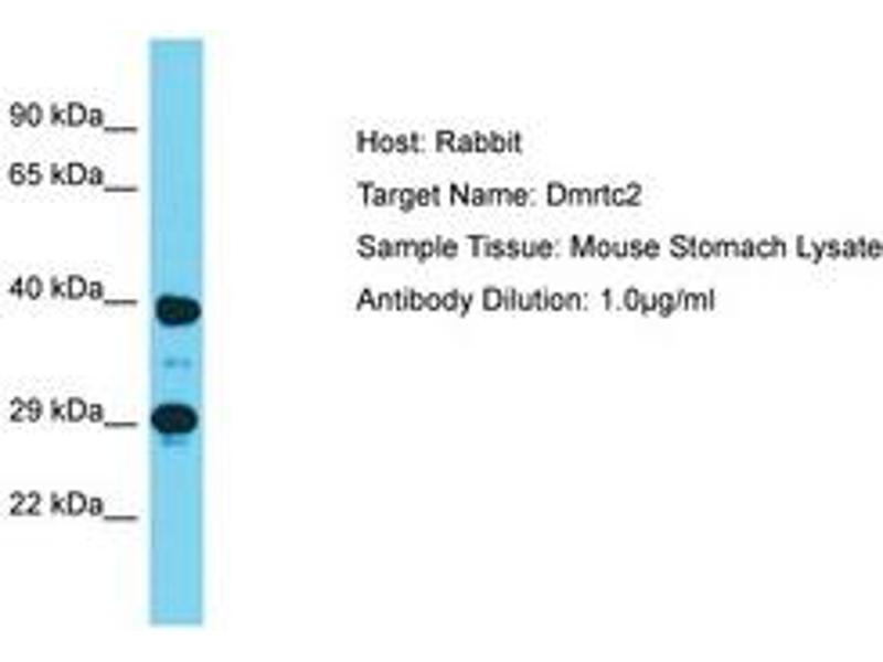 Synthetic peptide located between aa280-329 of mouse Dmrtc2 (Q8CGW9, NP_082008). Percent identity by BLAST analysis: Mouse, Rat (100%).