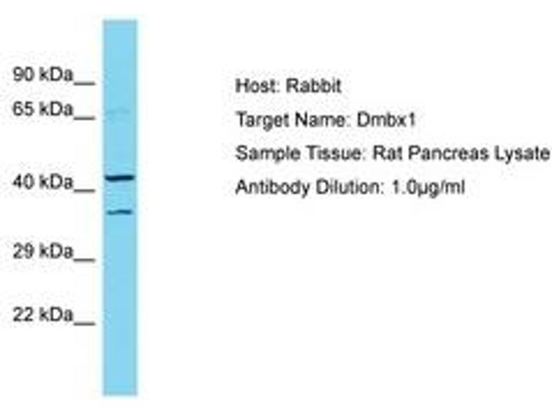 Synthetic peptide located between aa191-240 of rat Dmbx1 (NP_001101431). Percent identity by BLAST analysis: Rat (100%).