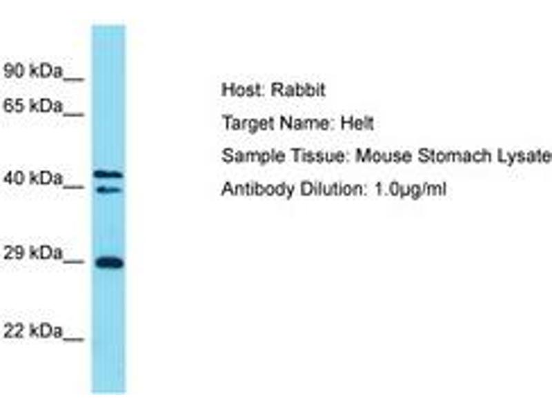Synthetic peptide located between aa138-187 of mouse Helt (Q7TS99, NP_776150). Percent identity by BLAST analysis: Mouse (100%).