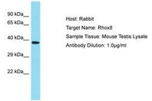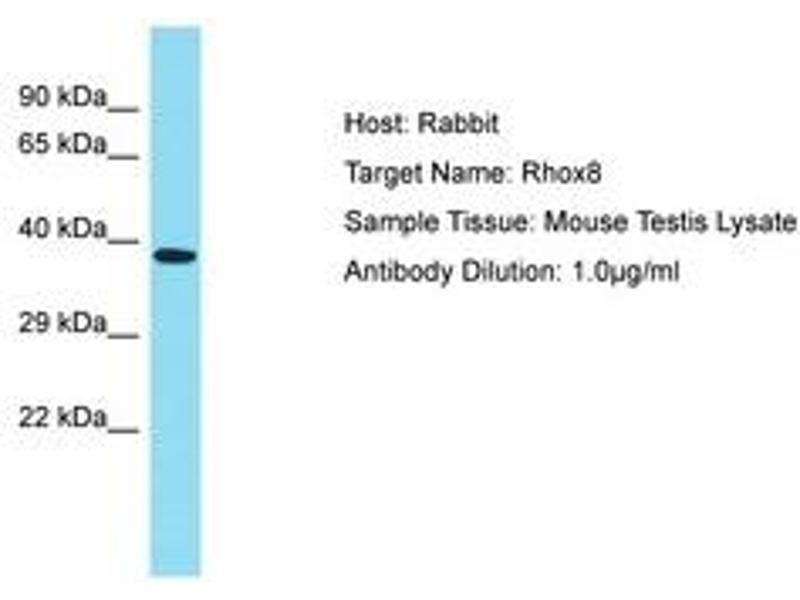 Synthetic peptide located between aa180-229 of mouse Rhox8 (Q6VSS7, NP_001004193). Percent identity by BLAST analysis: Mouse (100%).