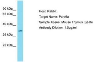 Synthetic peptide located between aa251-300 of mouse Pard6a (D3Z2R1, NP_001040901). Percent identity by BLAST analysis: Mouse (100%).