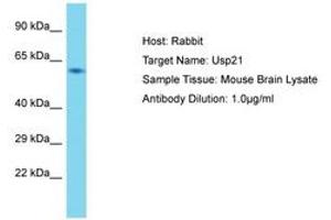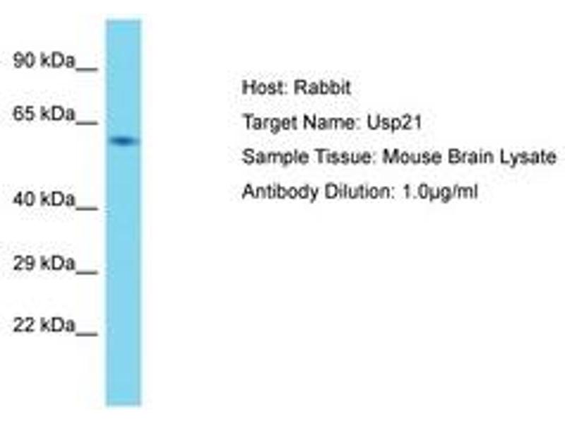 Synthetic peptide located between aa51-100 of mouse Usp21 (Q9QZL6, NP_038947). Percent identity by BLAST analysis: Mouse (100%).