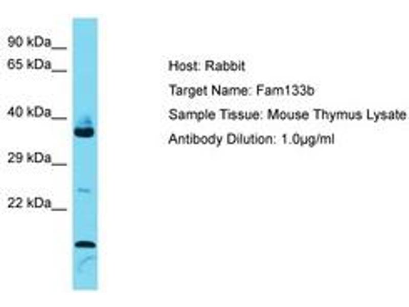 Synthetic peptide located between aa101-150 of mouse Fam133b (Q9CVI2, NP_001035966). Percent identity by BLAST analysis: Mouse (100%).