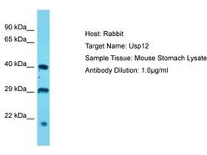 Synthetic peptide located between aa89-138 of mouse Usp12 (Q9D9M2, NP_035799). Percent identity by BLAST analysis: Human, Chimpanzee, Mouse, Rat, Bovine, Rabbit, Horse, Pig, Guinea pig (100%).