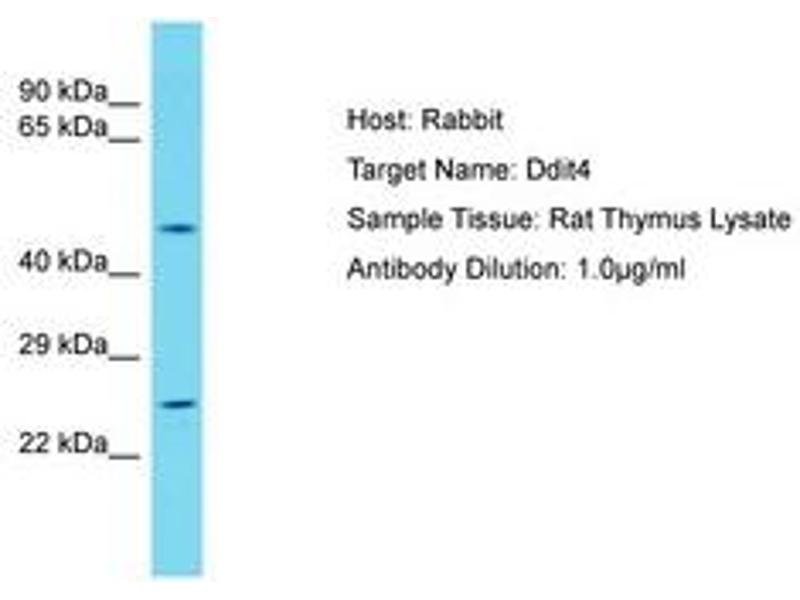 Synthetic peptide located between aa45-94 of rat Ddit4 (Q8VHZ9, NP_543182). Percent identity by BLAST analysis: Mouse, Rat (100%).