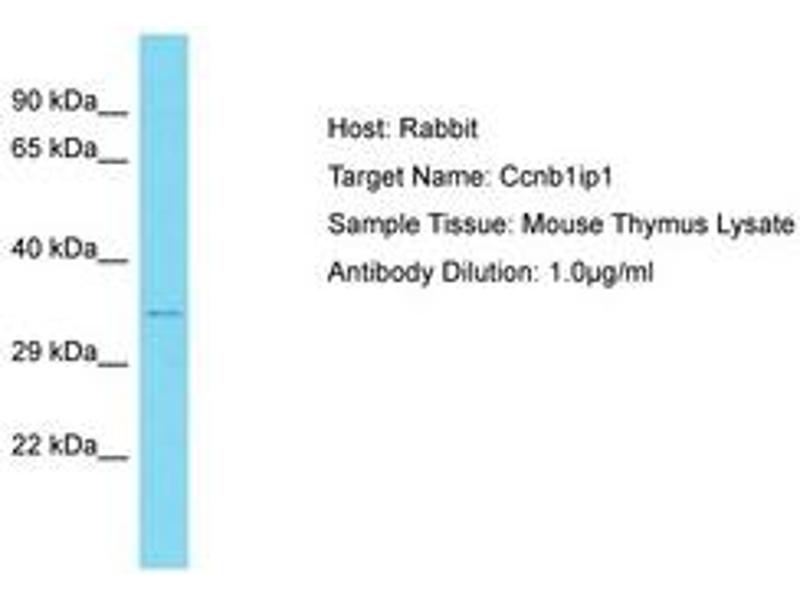 Synthetic peptide from N-Terminus of mouse Ccnb1ip1 (D3Z3K2, NP_001104589). Percent identity by BLAST analysis: Human, Chimpanzee, Mouse, Rabbit, Horse, Pig (100%).
