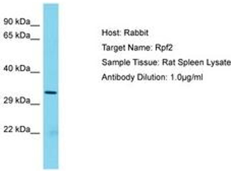 Synthetic peptide located between aa77-126 of rat Rpf2 (B0BN82, NP_001099861). Percent identity by BLAST analysis: Mouse, Rat, Bovine, Horse, Guinea pig (100%).