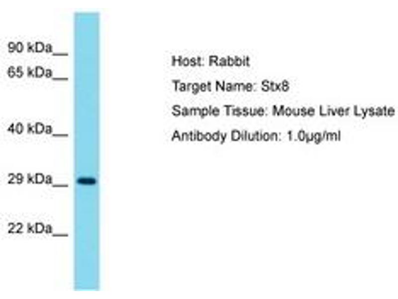 Synthetic peptide located between aa161-210 of mouse Stx8 (O88983, NP_061238). Percent identity by BLAST analysis: Mouse, Rat (100%).