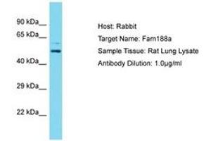 Synthetic peptide located between aa51-100 of rat Fam188a (D3Z916, NP_001099592). Percent identity by BLAST analysis: Rat (100%).