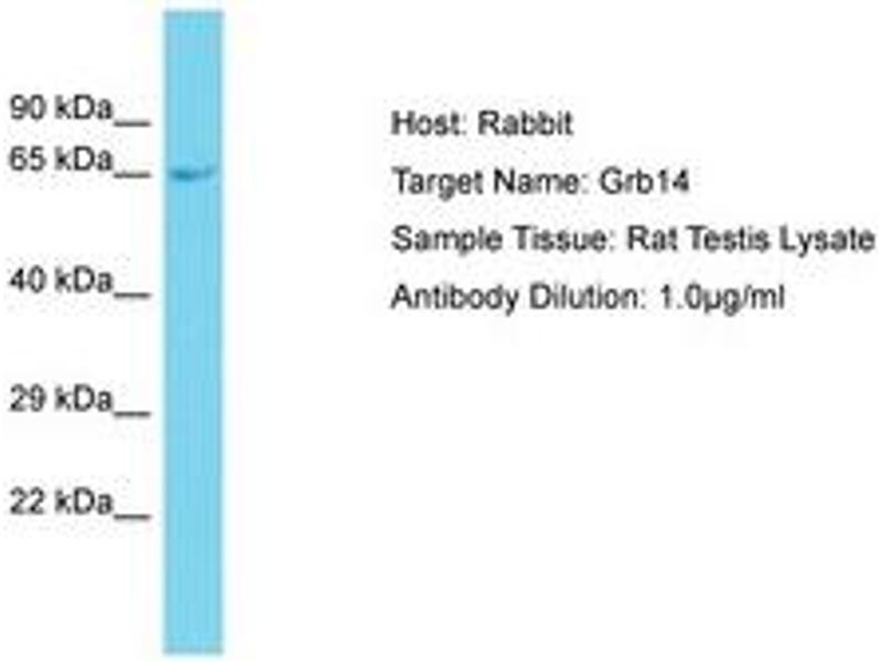 Synthetic peptide located between aa251-300 of rat Grb14 (O88900, NP_113811). Percent identity by BLAST analysis: Rat (100%).