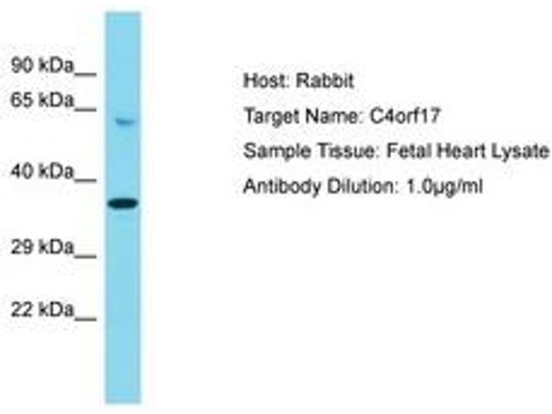 Synthetic peptide located between aa136-185 of human C4orf17 (Q53FE4, NP_115525). Percent identity by BLAST analysis: Human, Chimpanzee (100%).
