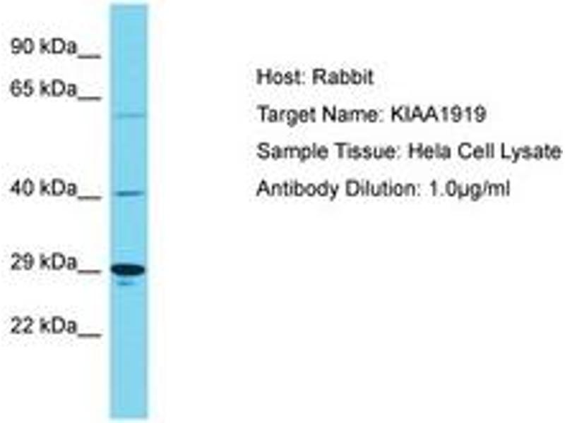 Synthetic peptide located between aa186-235 of human KIAA1919 (Q5TF39, NP_699200). Percent identity by BLAST analysis: Human, Chimpanzee (100%).