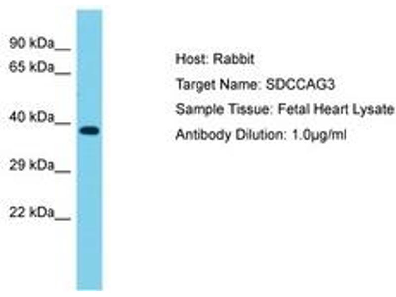 Synthetic peptide located between aa221-270 of human SDCCAG3 (NP_006634). Percent identity by BLAST analysis: Human, Chimpanzee (100%).