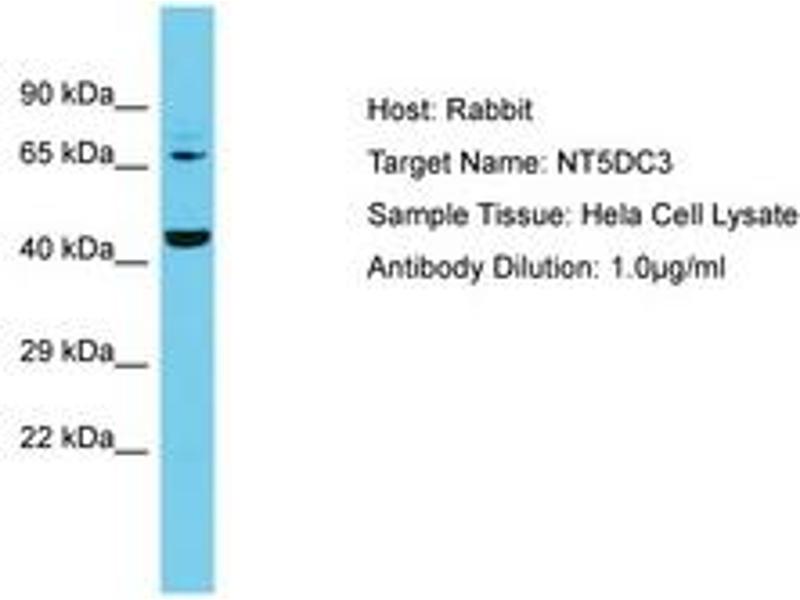 Synthetic peptide located between aa30-79 of human NT5DC3 (Q86UY8, NP_001026871). Percent identity by BLAST analysis: Human, Chimpanzee (100%).