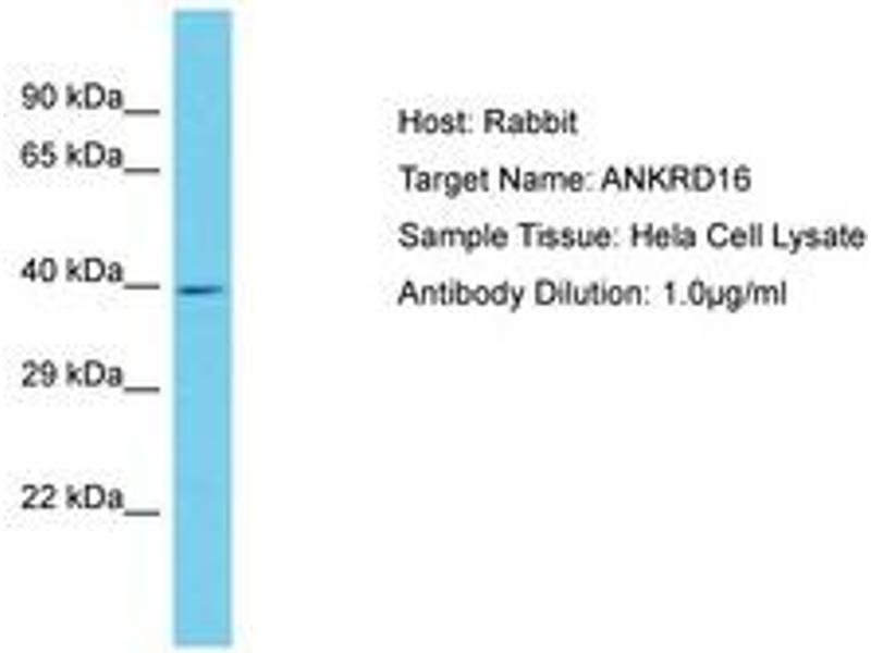 Synthetic peptide located between aa43-92 of human ANKRD16 (Q6P6B7, NP_061919). Percent identity by BLAST analysis: Human, Chimpanzee (100%).