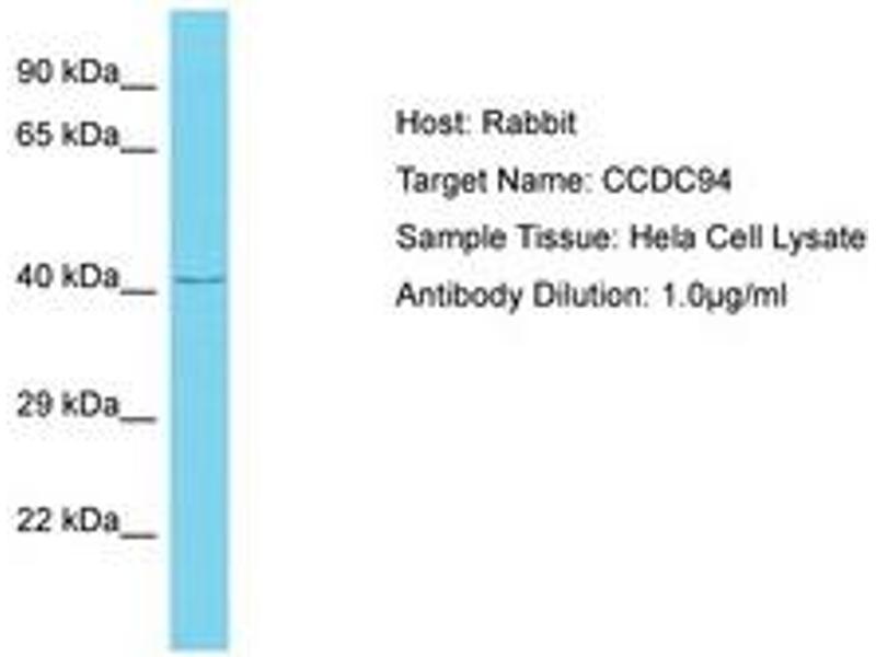 Synthetic peptide located between aa239-288 of human CCDC94 (Q9BW85, NP_060544). Percent identity by BLAST analysis: Human (100%).