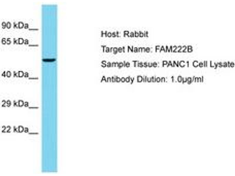 Synthetic peptide located between aa435-484 of human FAM222B (Q8WU58, NP_060652). Percent identity by BLAST analysis: Human, Chimpanzee (100%).