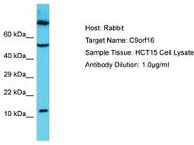 Synthetic peptide from C-Terminus of human C9orf16 (Q9BUW7, NP_077017). Percent identity by BLAST analysis: Human, Chimpanzee, Horse, Pig (100%).