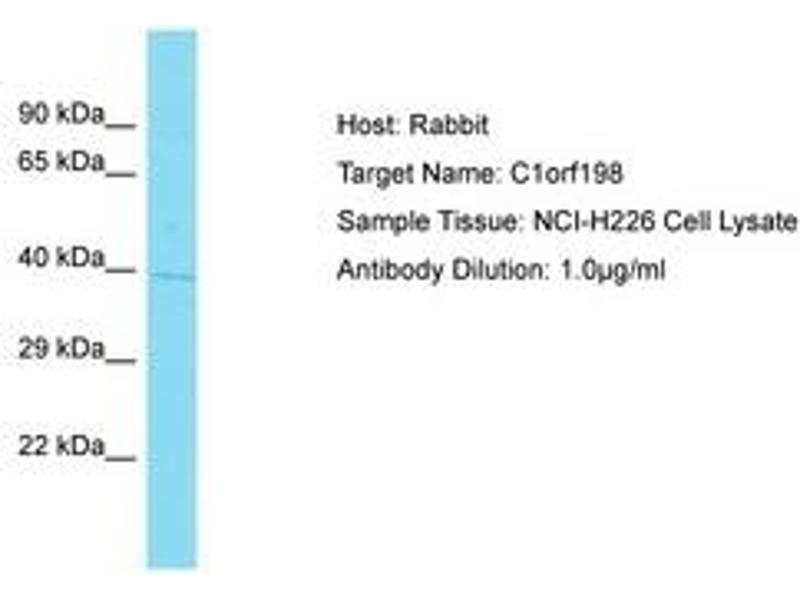 Synthetic peptide located between aa225-274 of human C1orf198 (Q9H425, NP_116189). Percent identity by BLAST analysis: Human, Chimpanzee (100%).
