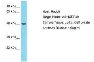 Synthetic peptide located between aa172-221 of human ARHGEF39 (Q8N4T4, NP_116207). Percent identity by BLAST analysis: Human, Chimpanzee, Horse (100%).