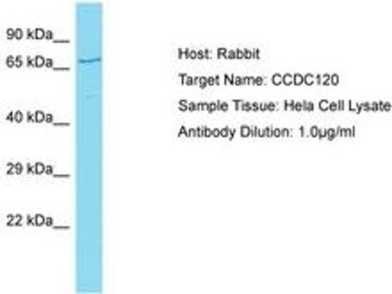 Synthetic peptide located between aa329-378 of human CCDC120 (Q96HB5, NP_296375). Percent identity by BLAST analysis: Human, Chimpanzee (100%).