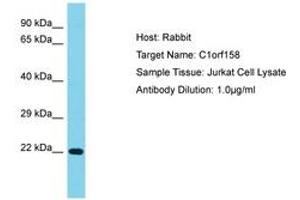 Synthetic peptide located between aa25-74 of human C1orf158 (Q8N1D5, NP_689503). Percent identity by BLAST analysis: Human, Chimpanzee (100%).