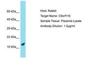 Synthetic peptide located between aa39-88 of human C9orf116 (Q5BN46, NP_001041730). Percent identity by BLAST analysis: Human, Chimpanzee (100%).