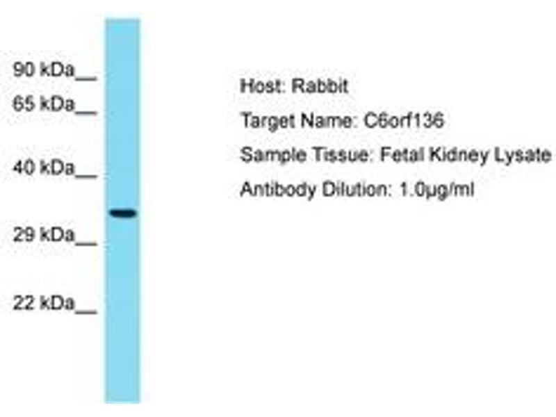 Synthetic peptide located between aa220-269 of human C6orf136 (Q5SQH8, NP_001103408). Percent identity by BLAST analysis: Human, Chimpanzee (100%).