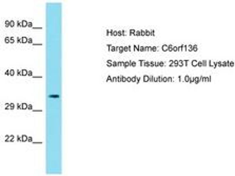 Synthetic peptide located between aa116-165 of human C6orf136 (Q5SQH8, NP_001103408). Percent identity by BLAST analysis: Human, Chimpanzee (100%).