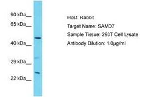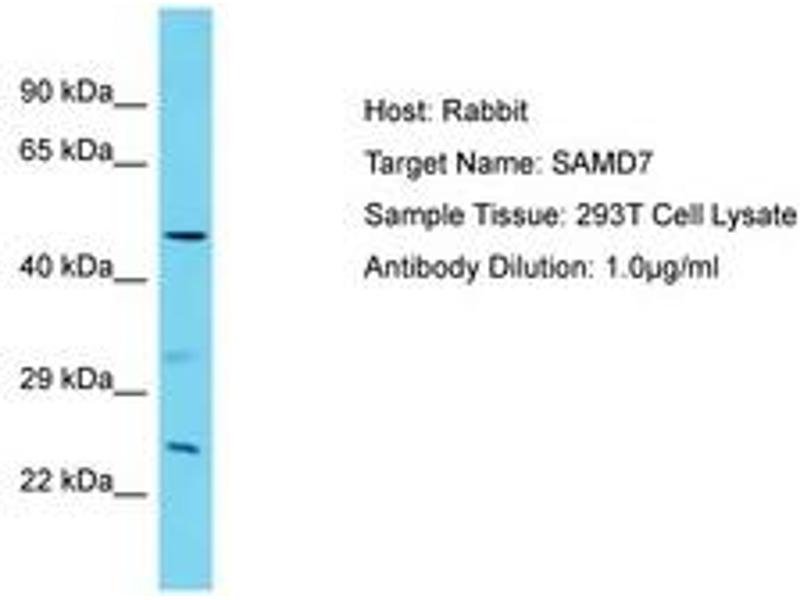 Synthetic peptide located between aa175-224 of human SAMD7 (Q7Z3H4, NP_872416). Percent identity by BLAST analysis: Human (100%).