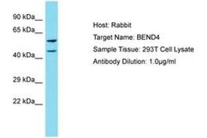 Synthetic peptide located between aa435-484 of human BEND4 (Q6ZU67, NP_997289). Percent identity by BLAST analysis: Human, Chimpanzee, Mouse, Rat, Bovine, Horse, Pig, Chicken (100%).