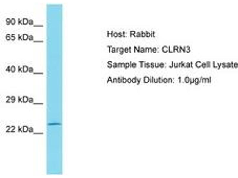 Synthetic peptide located between aa151-200 of human CLRN3 (Q8NCR9, NP_689524). Percent identity by BLAST analysis: Human (100%).