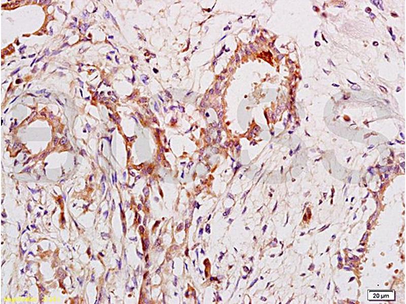 Background: The alpha subunit has cell adhesive properties. Can act both as an adhesion and an anti-adhesion protein. May provide a protective layer on epithelial cells against bacterial and enzyme attack. The beta subunit contains a C-terminal domain which is involved in cell signaling, through phosphorylations and protein-protein interactions. Modulates signaling in ERK, SRC and NF-kappa-B pathways. In activated T-cells, influences directly or indirectly the Ras/MAPK pathway. Promotes tumor progression. Regulates TP53-mediated transcription and determines cell fate in the genotoxic stress response. Binds, together with KLF4, the PE21 promoter element of TP53 and represses TP53 activity.