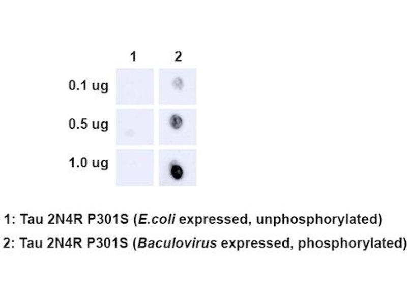 A 1:500 dilution of ABIN6932885 was sufficient for detection of Tau in 10 μg Baculovirus by dot blot analysis using Goat Anti-Rabbit IgG:HRP as the secondary antibody.