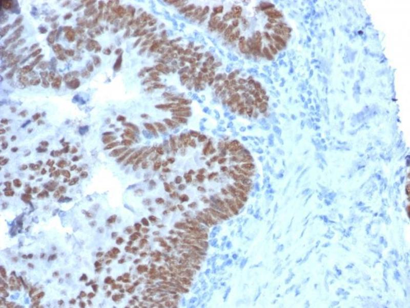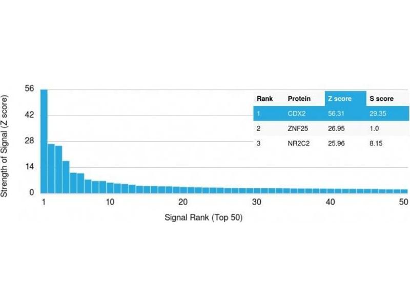 - The specificity of this monoclonal antibody to its intended target was validated by HuProtTM Array, containing more than 19,000, full-length human proteins. The intestine-specific transcription factors CDX1 and CDX2 are important for directing intestinal development, differentiation, proliferation and maintenance of the intestinal phenotype. CDX2 protein expression has been seen in GI carcinomas. Anti-CDX2 has been useful to establish GI origin of metastatic adenocarcinomas and carcinoidsand is especially useful to distinguish metastatic colorectal adenocarcinoma from lung adenocarcinoma.However, mucinous carcinomas of the ovary also express CDX2 protein. It limits the usefulness of this marker in the distinction of metastatic colorectal adenocarcinoma from mucinous carcinoma of the ovary.