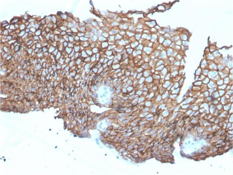 - Recognizes a protein of 130 kDa, identified as Desmoglein-3 (DSG3). This MAb is highly specific to Desmoglein-3 and does not cross-react with other members of the Desmoglein-family. DSG3 is a calcium-binding transmembrane glycoprotein component of desmosomes in vertebrate epithelial cells. Research has shown that DSG3 has a very high sensitivity (80 % ) and specificity (100 %) in recognizing squamous cell carcinoma (SqCC). Therefore, DSG3 is considered a very important marker for lung SqCC and can be a useful ancillary marker to separate SqCC from other subtypes of lung cancer. Moreover, studies have shown that DSG3 expression in lung SqCC may indicate a poor prognosis.