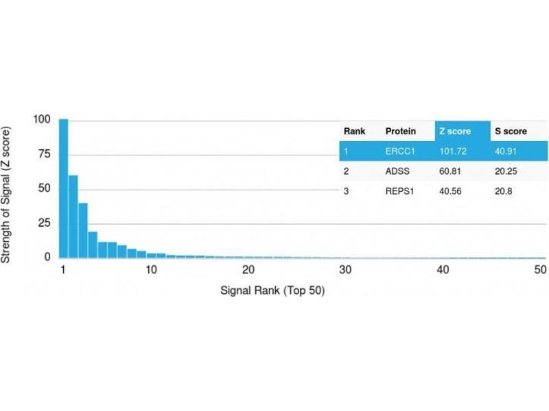 - Recognizes a protein of 110 kDa, identified as Excision Repair Cross Complementing 1 (ERCC1). It is a mammalian nucleotide excision repair (NER) enzyme involved in repair of damaged DNA. ERCC1 is a homologous to RAD10 in Saccharomyces cerevisiae, which is required in mitotic intrachromosomal recombination and repair. ERCC1 is required in repair of cisplatin-induced DNA adducts and ultraviolet (UV)-induced DNA damage. High expression of ERCC1 has been linked to tumor progression in a variety of cancers including non-small cell lung cancer (NSCLC), squamous cell carcinoma of the head, ovarian cancer and esophageal cancer.