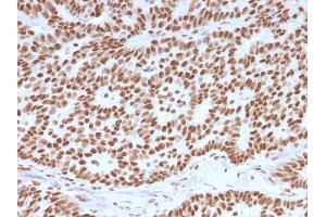 This monoclonal antibody is specific to estrogen receptor alpha (ER alpha) and shows minimal cross-reaction with other members of the family. ER is an important regulator of growth and differentiation in the mammary gland. Presence of ER in breast tumors indicates an increased likelihood of response to anti-estrogen (e.g. tamoxifen) therapy. It strongly stains nuclei of epithelial cells in breast carcinomas.