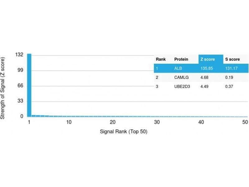 - This MAb is absolutely specific to albumin and does not show any significant cross-reaction with other human proteins. Albumin is a soluble, monomeric protein, which comprises about one half of the blood serum protein. Albumin functions primarily as a carrier protein for steroids, fatty acids, and thyroid hormones and plays a role in stabilizing extracellular fluid volume.Albumin is synthesized in the liver as preproalbumin, which has an N-terminal peptide that is removed before the nascent protein is released from the rough endoplasmic reticulum. The product, proalbumin, is in turn cleaved in the Golgi vesicles to produce the secreted form of albumin.