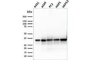 Positive Control: A431, A549, PC3, HAP1, HePG2, MCF-7, HeLa, NIH/3T3 and C6 whole cell lysates. Human ovarian carcinoma.