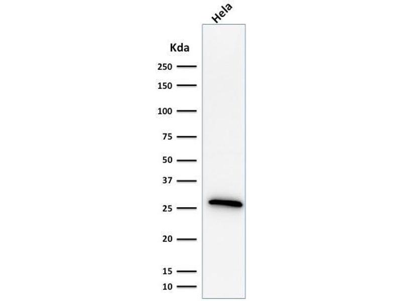 Positive Control: MCF-7 cells. ~50 % of Breast Carcinomas are positive for hsp27 especially those that are also positive for ER and/or PgR. HeLa cells.