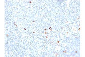 - Recognizes a protein of 75 kDa, identified as mu heavy chain of human immunoglobulins. It does not cross-react with alpha (IgA), gamma (IgG), epsilon (IgE), or delta (IgD), heavy chains, T-cells, monocytes, granulocytes, or erythrocytes. Monomeric IgM is expressed as a membrane bound antibody on the surface of B cells and as a pentamer when secreted by plasma cells. IgM antibody is prominent in early immune responses to most antigens. Aberrant levels are associated with immune deficiency states, hereditary deficiencies, myeloma, Waldenstrom's macroglobulinemia, chronic infection and hepatocellular disease. This MAb is useful in the identification of leukemias, plasmacytomas, and certain non-Hodgkin s lymphomas. The most common feature of these malignancies is the restricted expression of a single heavy chain class. Demonstration of clonality in lymphoid infiltrates indicates that the infiltrate is clonal and therefore malignant.