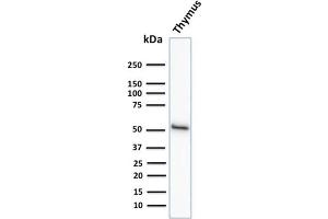 Positive Control: A431 cells. Skin, Thymus, Colon or Prostate.