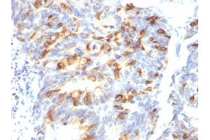 - Recognizes a single glycoprotein of 520 kDa, identified as mucin 2 (MUC2). This MAb shows no cross-reaction with human milk fat globule membranes, MUC1, or MUC3. Mucins are high molecular weight glycoproteins, which constitute the major component of the mucus layer that protects the gastric epithelium.MUC2 is specifically expressed in goblet cells of the small intestine in about 65 % of colonic carcinomas and about 40 % of gastric carcinomas. MUC2 is rarely expressed outside of the GI tract with the exceptions of mucinous carcinoma of breast and clear cell-type carcinomas of the ovary.