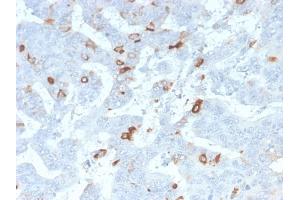 - Recognizes a single glycoprotein of 520 kDa, identified as mucin 2 (MUC2). This MAb shows no cross-reaction with human milk fat globule membranes, MUC1, or MUC3. Its epitope has been defined as GTQTP (GlyThrGlnThrPro). Mucins are high molecular weight glycoproteins, which constitute the major component of the mucus layer that protects the gastric epithelium. MUC2 is specifically expressed in goblet cells of the small intestine in about 65 % of colonic carcinomas and about 40 % of gastric carcinomas. MUC2 is rarely expressed outside of the GI tract with the exceptions of mucinous carcinoma of breast and clear cell-type carcinomas of the ovary.