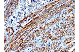 - Smooth muscle myosin heavy chain (SM-MHC) is a cytoplasmic structural protein, which is a major component of the contractile apparatus in smooth muscle cells. Expression of smooth muscle myosin is developmentally regulated, appearing early in smooth muscle development, and is specific for smooth muscle development. Two isoforms of smooth muscle myosin heavy chain have been identified, designated MHC-1 and MHC-2. The antibody may be useful for the study of breast tumors as the presence of an intact layer of myoepithelial cells is an important feature, which may distinguish benign breast lesions and carcinoma in situ from invasive tumors.