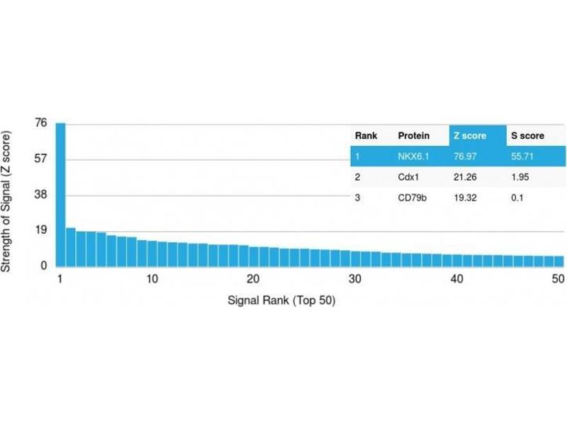 - Members of the Nkx family of homeodomain proteins are key regulators of growth and development in several tissues, including brain, heart and pancreas. During neural development, sonic hedgehog (Shh) is known to control cell fate and mitogenesis, which is correlated with Shh dose-dependent expression of several genes, including Nkx-6.1. Specifically, Nkx-6.1 is responsible for cellular differentiation in the ventral neural tube and spinal meninges in response to Shh. In the pancreas, Nkx-6.1 is exclusively expressed in the islets of Langerhans in differentiating and mature B cells, which produce Insulin. The presence of Pdx-1 is required for the expression of Nkx-6.1 as well as other pancreatic B cell specific genes, including Insulin, Glut2 and IAPP. Subsequently, Nkx-6.1 binds to the DNA consensus sequence, TTAATTAC, to direct the repression of specific genes in B cells. Nkx6.1 is highly expressed in pancreatic and duodenal well-differentiated neuroendocrine tumors (WDNETS) and in metastatic WDNETS, is a highly specific marker of tumors of pancreatic origin. It has thus been suggested that Nkx6.1 is a useful inclusion into IHC panels for identifying primary sites of WDNETS.